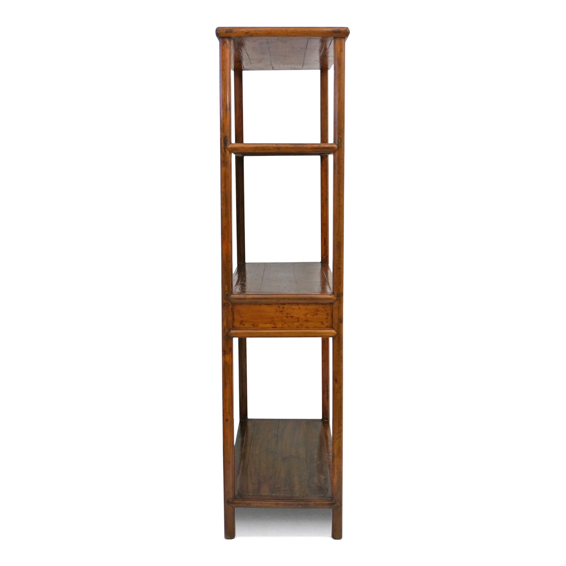 Freestanding 19th Century Chinese fruitwood etagere featuring four shelves and two short drawers with ring pulls