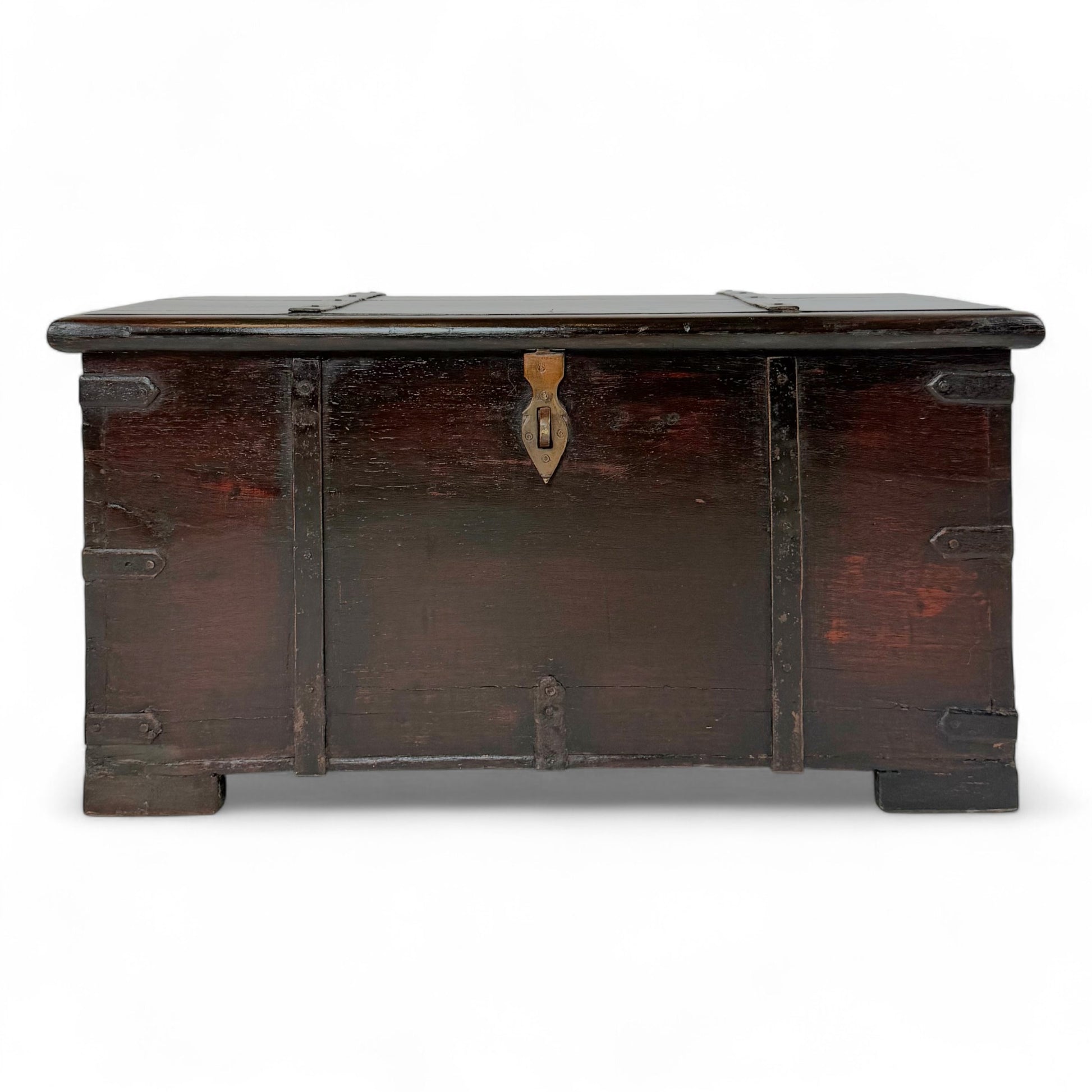 Antique small wooden trunk with wrought iron hinges and bracing.