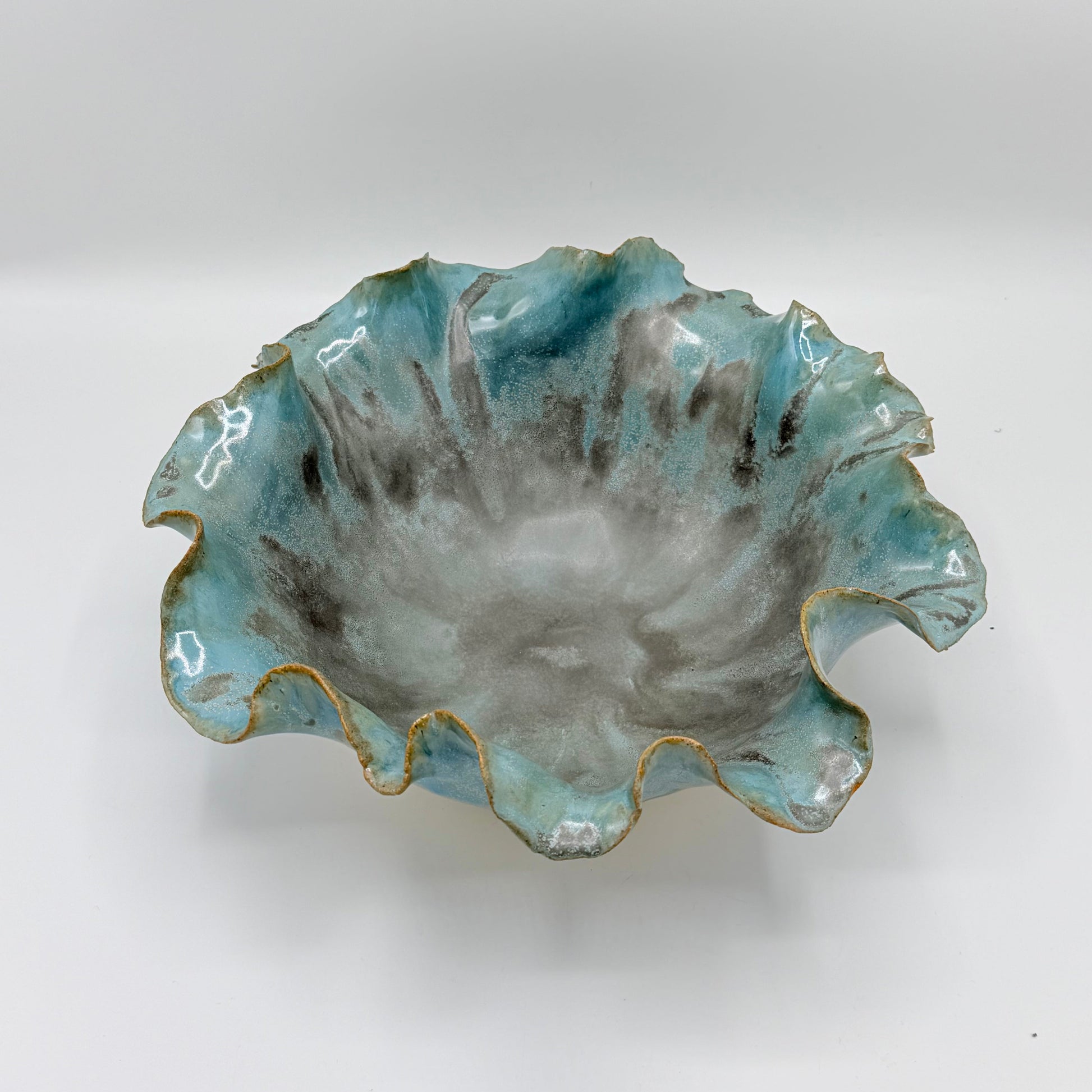Handmade stoneware bowl with aqua hues and light brown undertones, crowned at the top with a gracefully ruffled rim. By Lisa Paolella, signed.