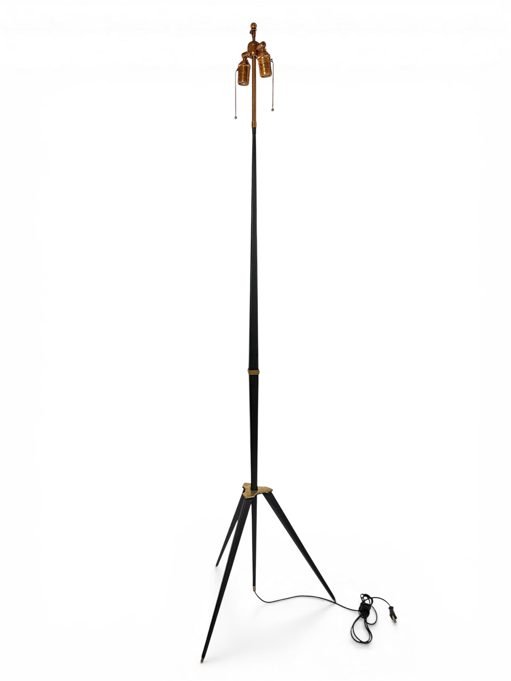 Slim, black iron standing lamp with brass details on tripod base