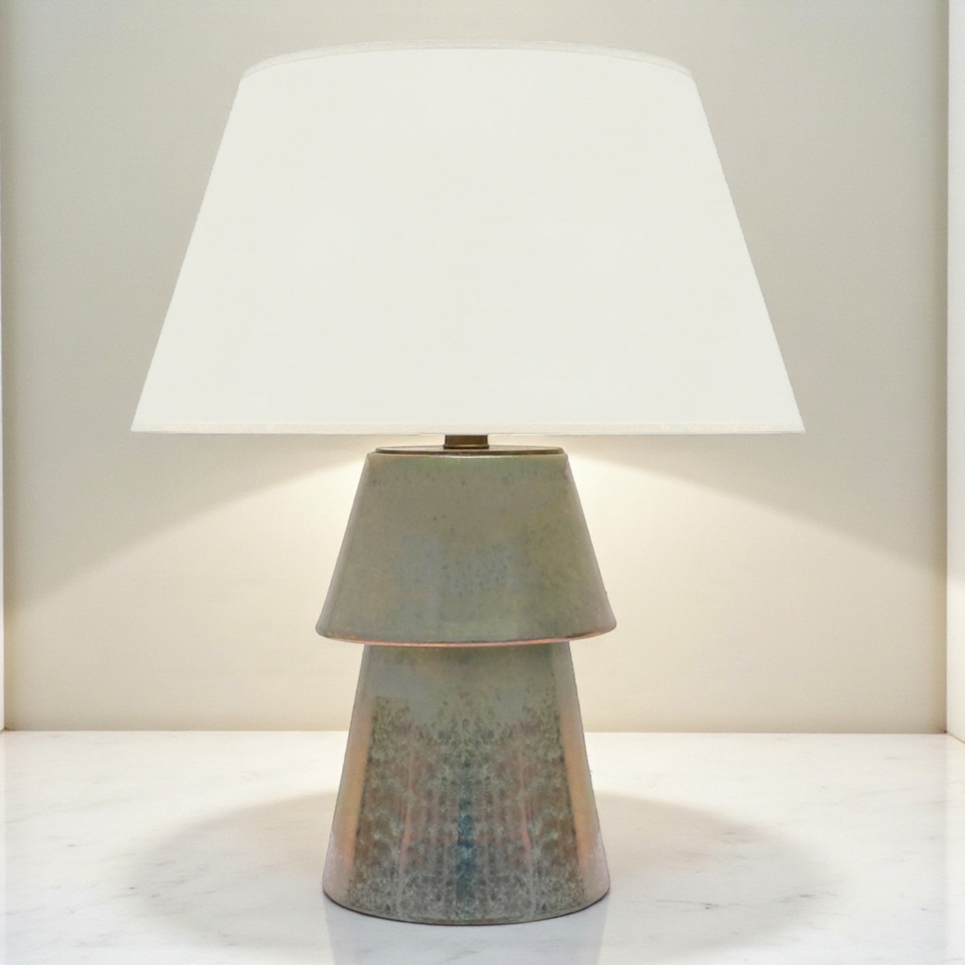Shaped stoneware blue/green iridescent glazed table lamp.