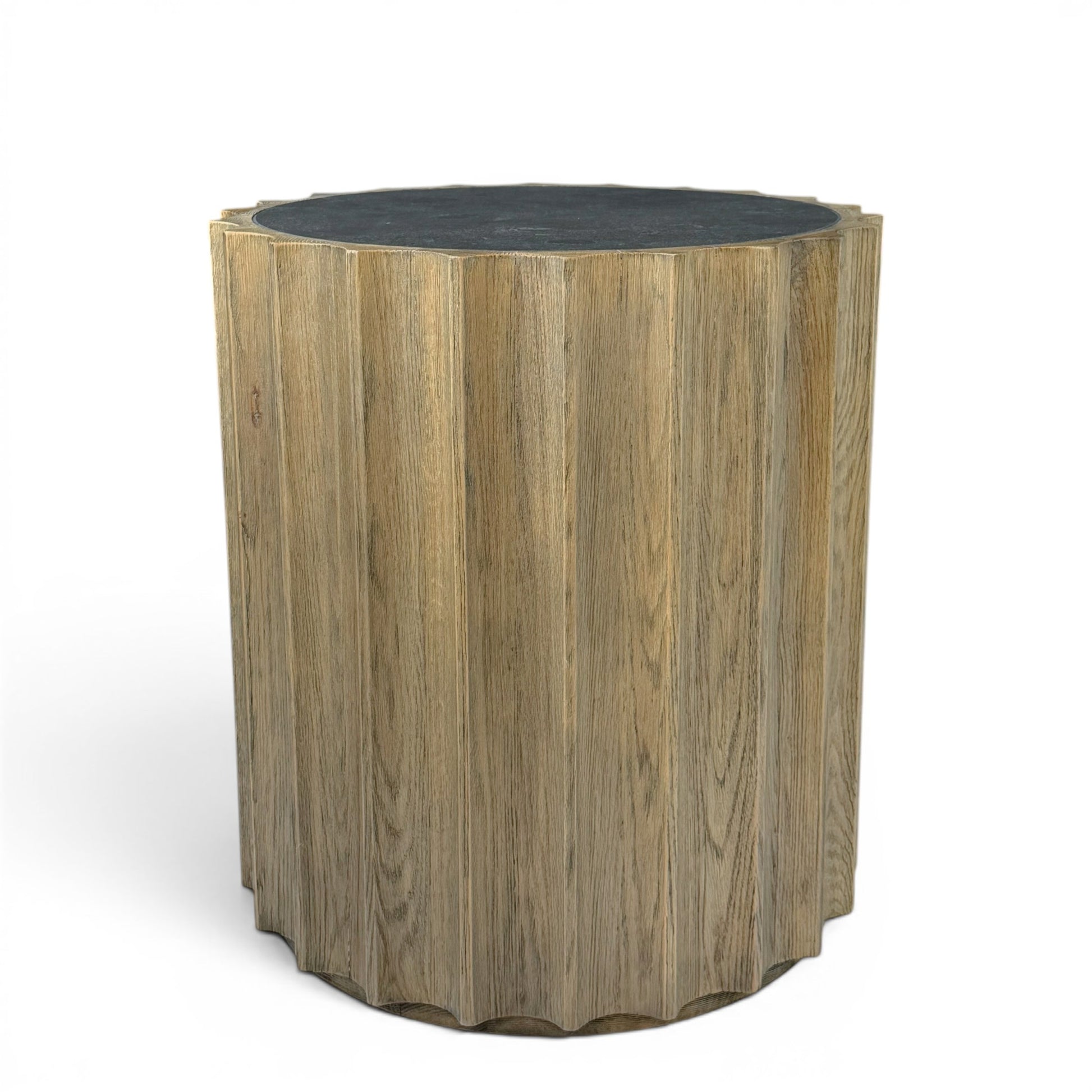 Circular oak table with fluted sides and inset bluestone top