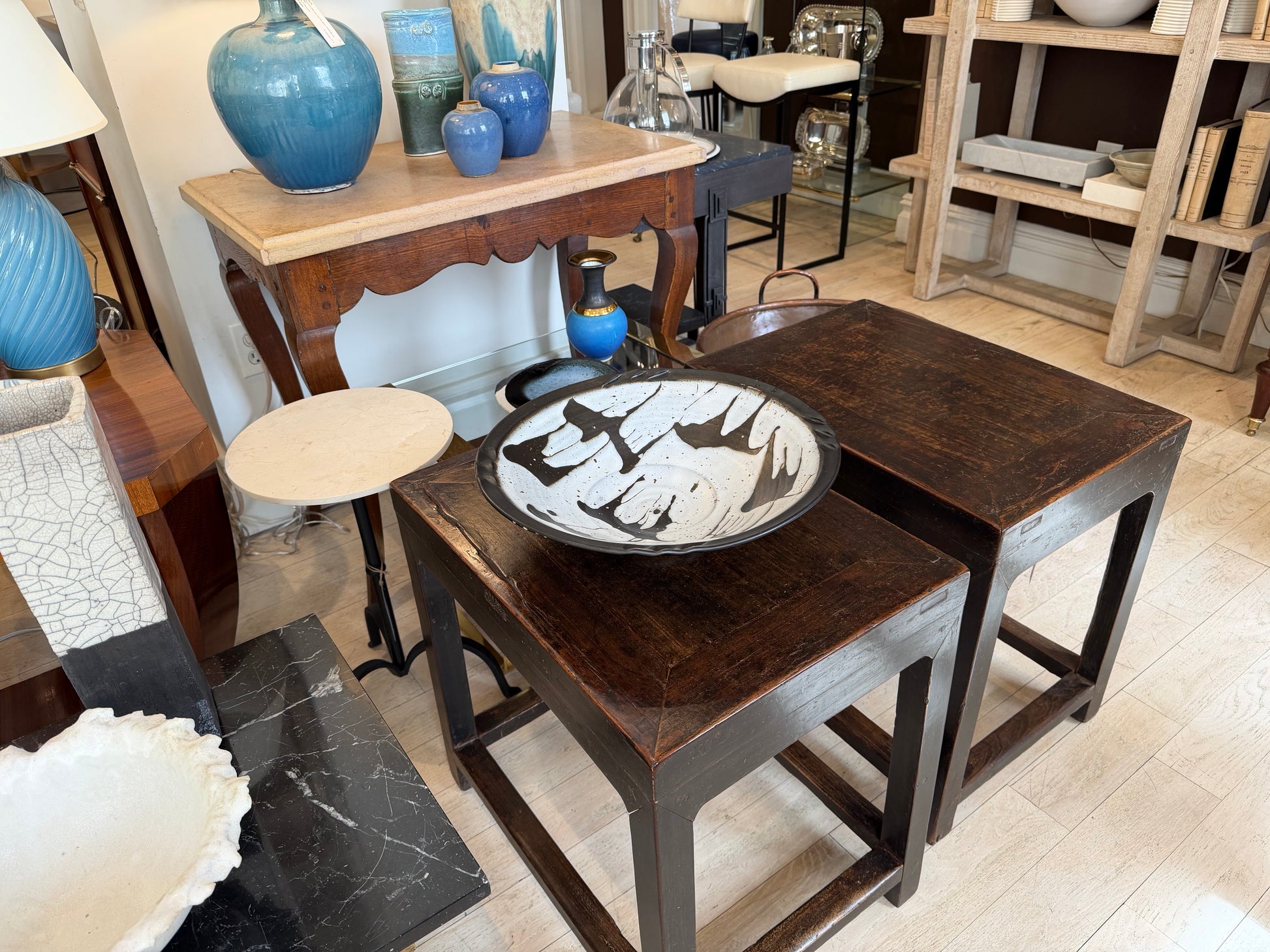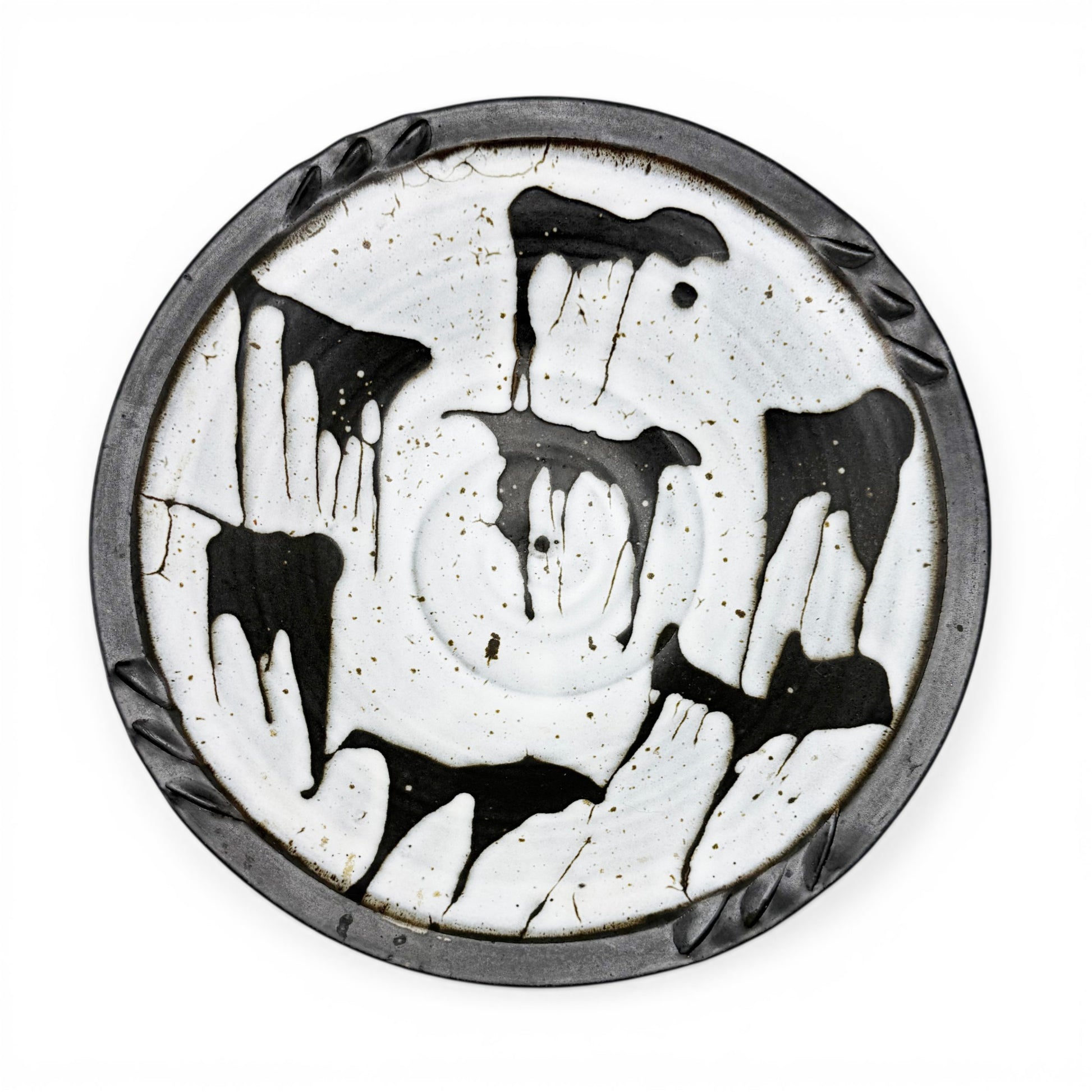 Hand made, black and white terra cotta bowl with abstract drip glaze