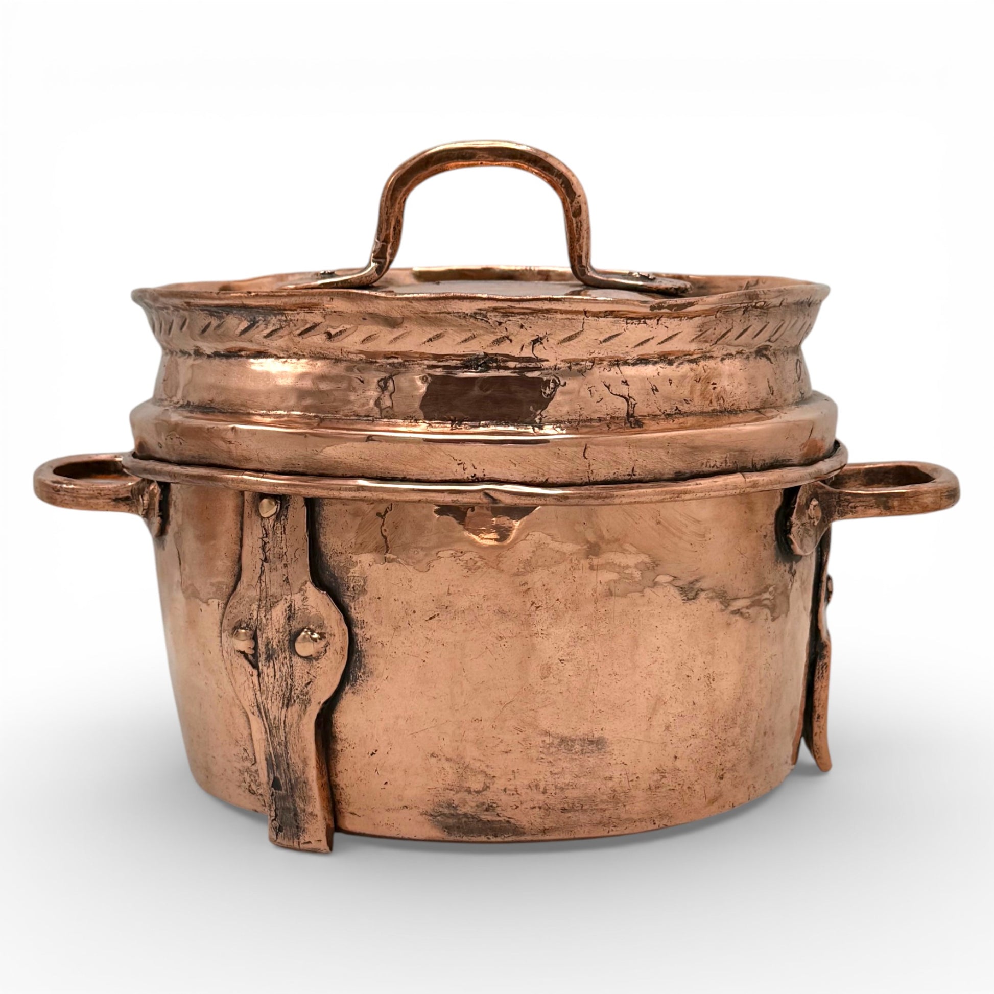 Antique French copper pot with fitted lid and loop handles on both pot and lid