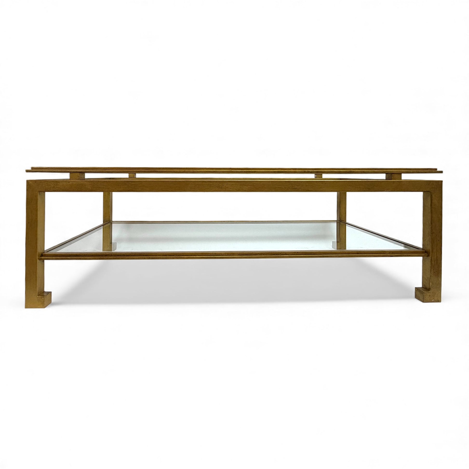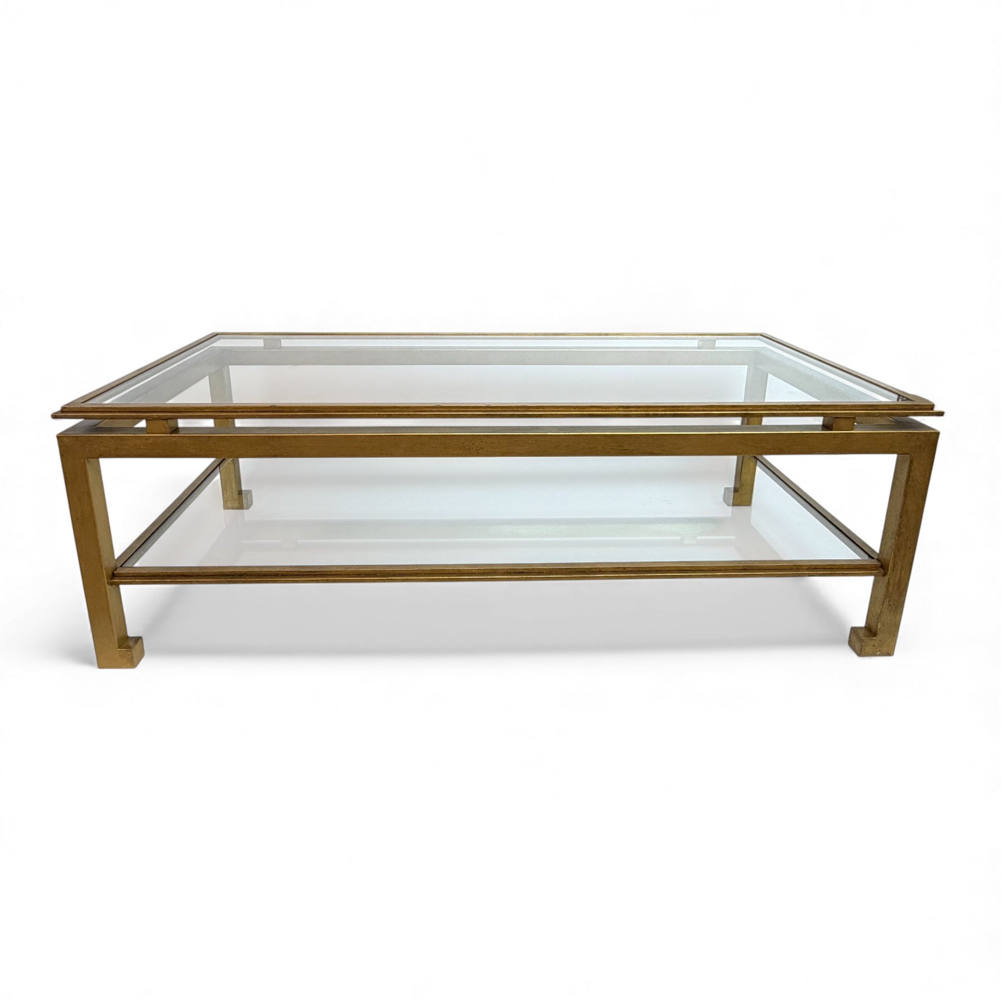 Rectangular gilt iron coffee table with two tiered glass shelves, by Maison Ramsay