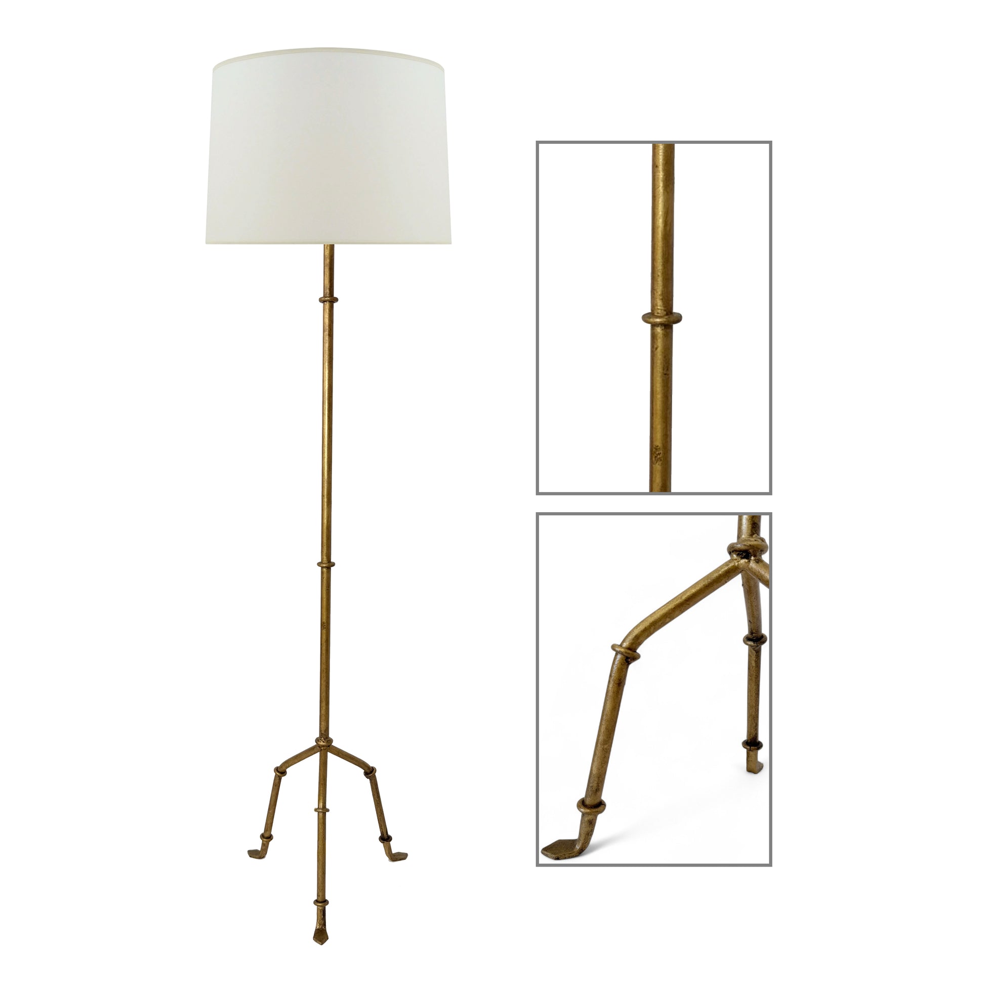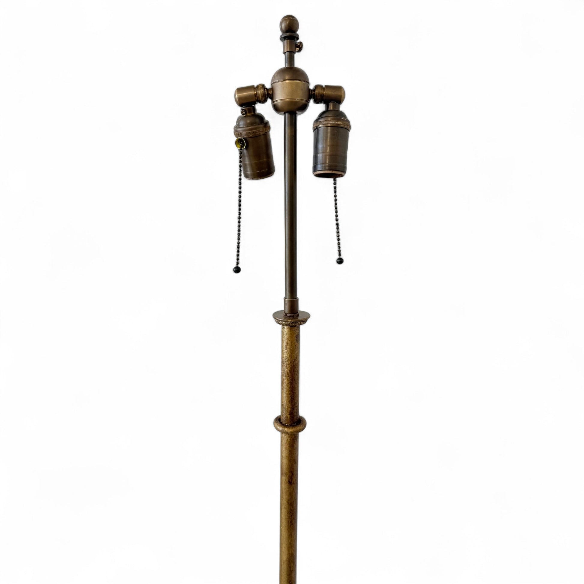 Vintage Spanish gilt iron standing lamp on stylized tripod base. Newly rewired for US specifications (Not UL Listed) with a dual-socket arrangement and pull chain switch.