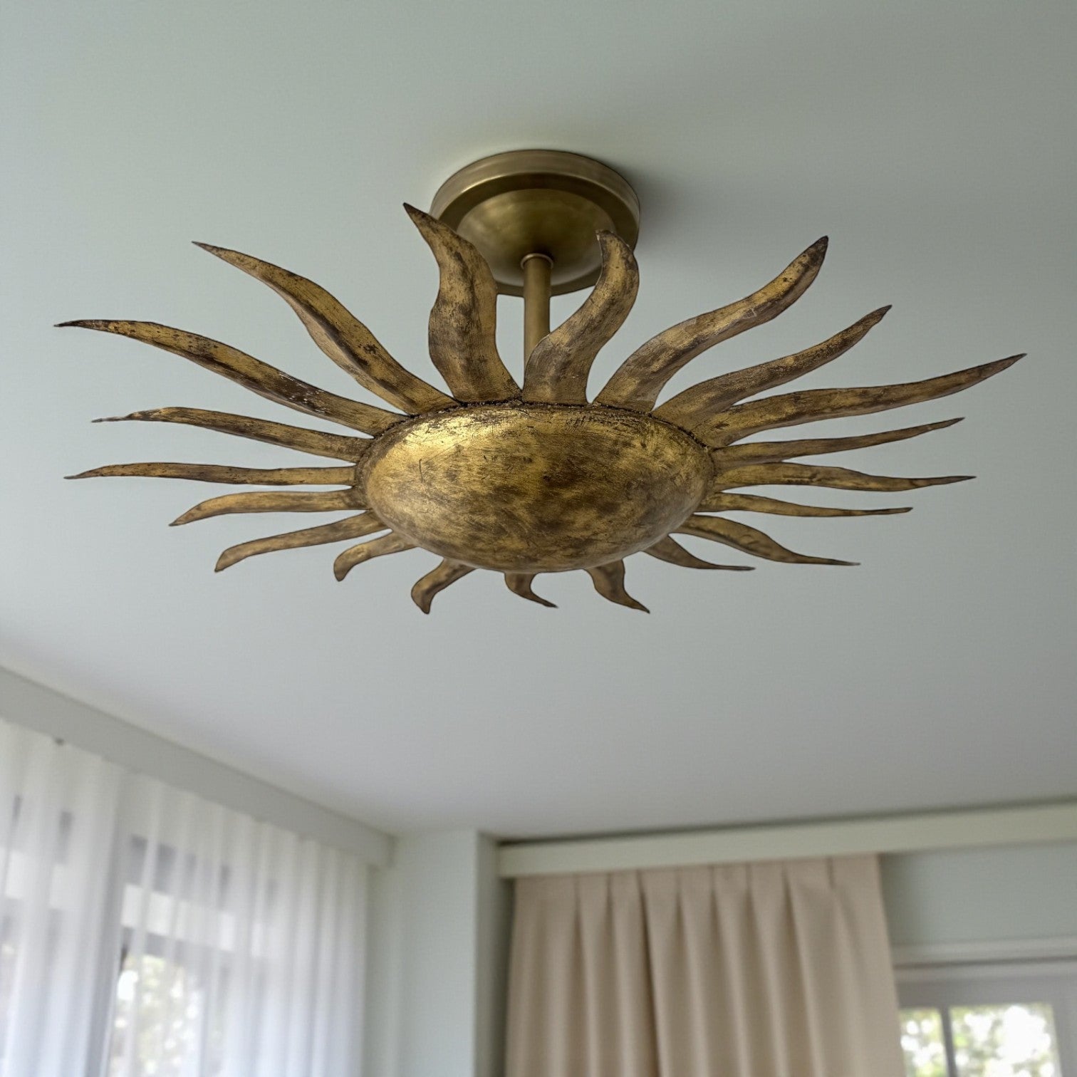 Vintage Spanish gilt iron sunburst light fixture with wavy "ray" arms