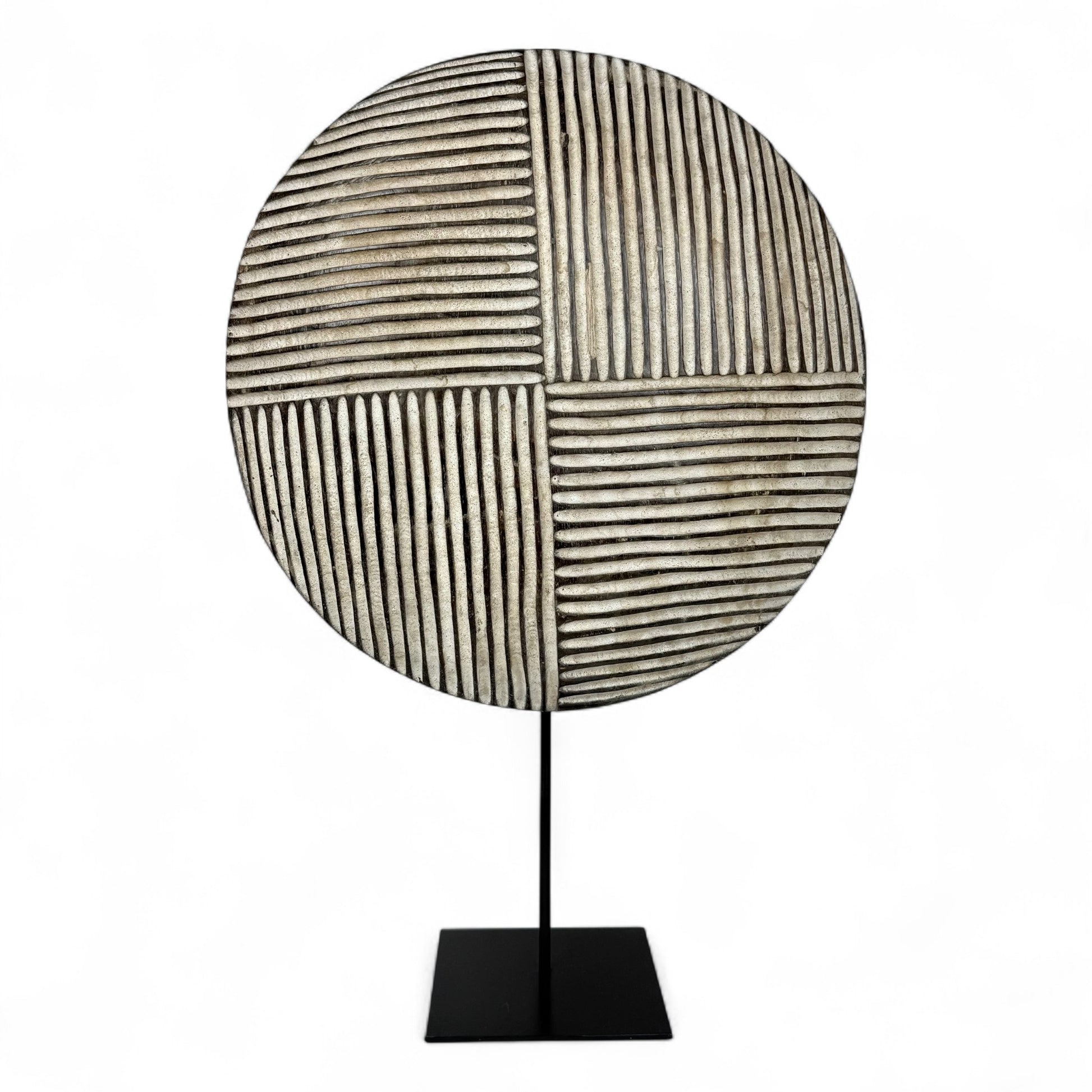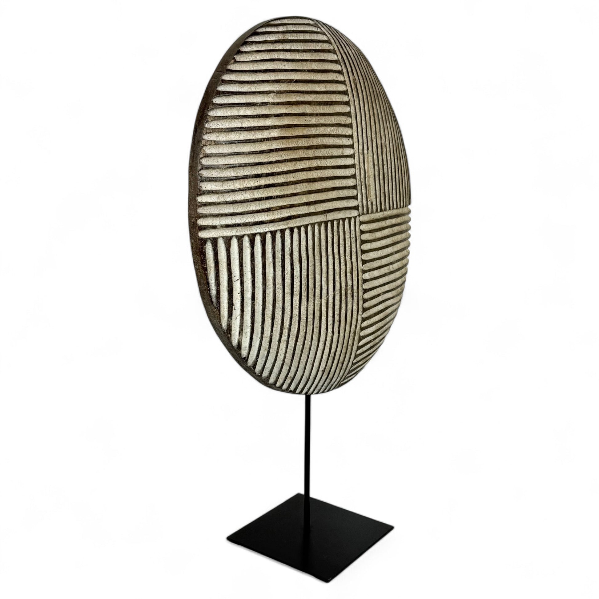 Hand-carved wood shield mounted on steel base, originating from the Bamileke people of the Grasslands region in Cameroon.