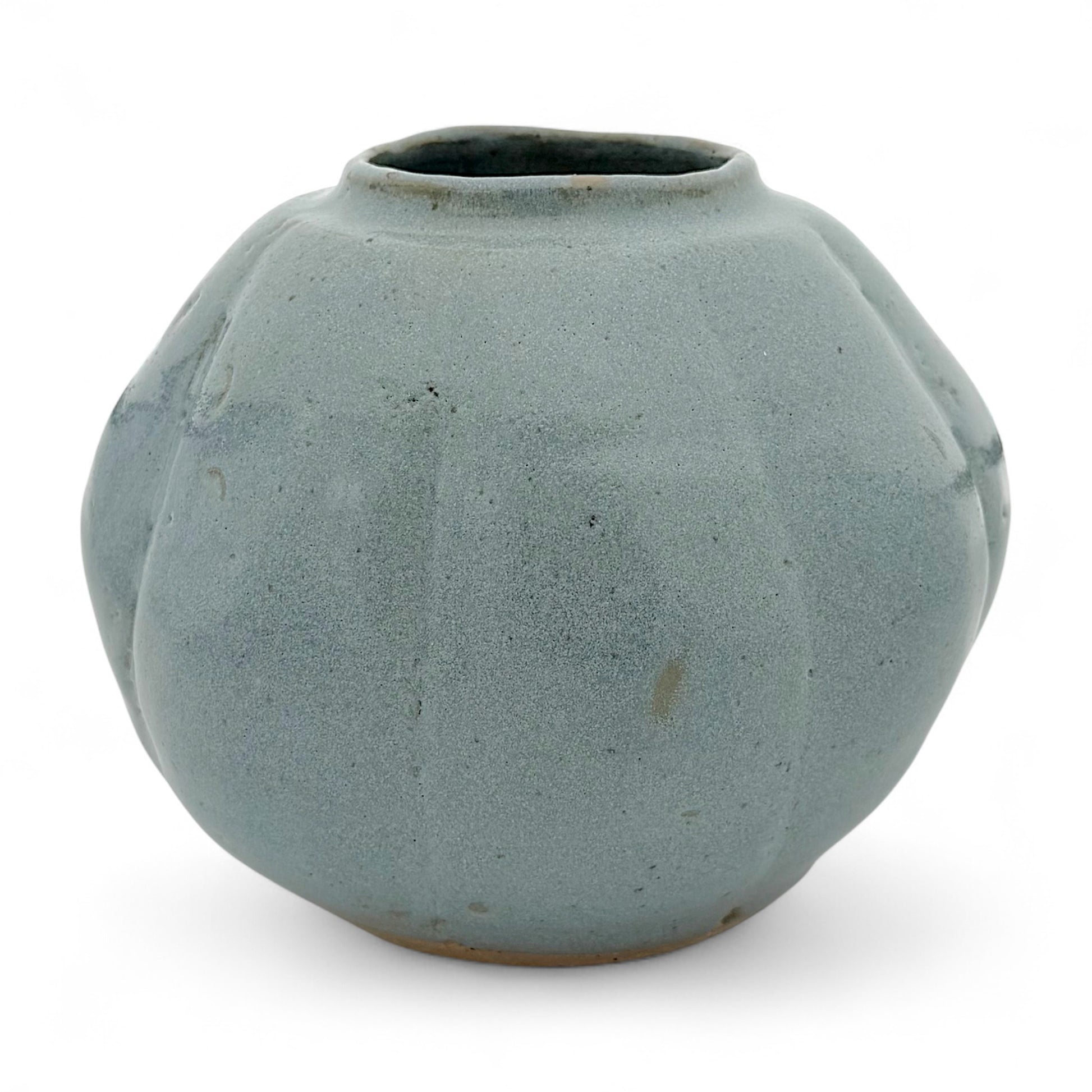 Round, handmade pale blue stoneware vase, signed.