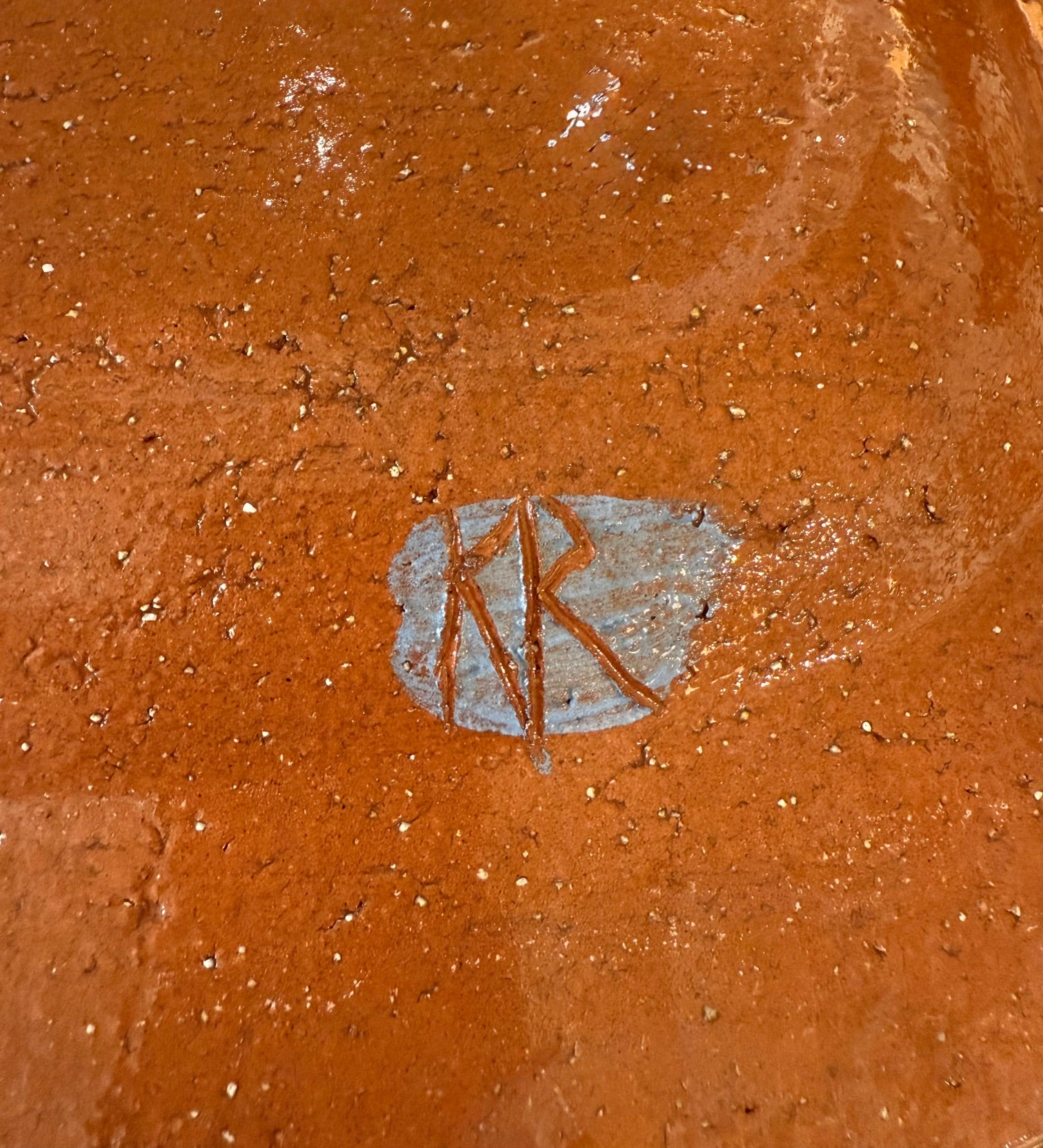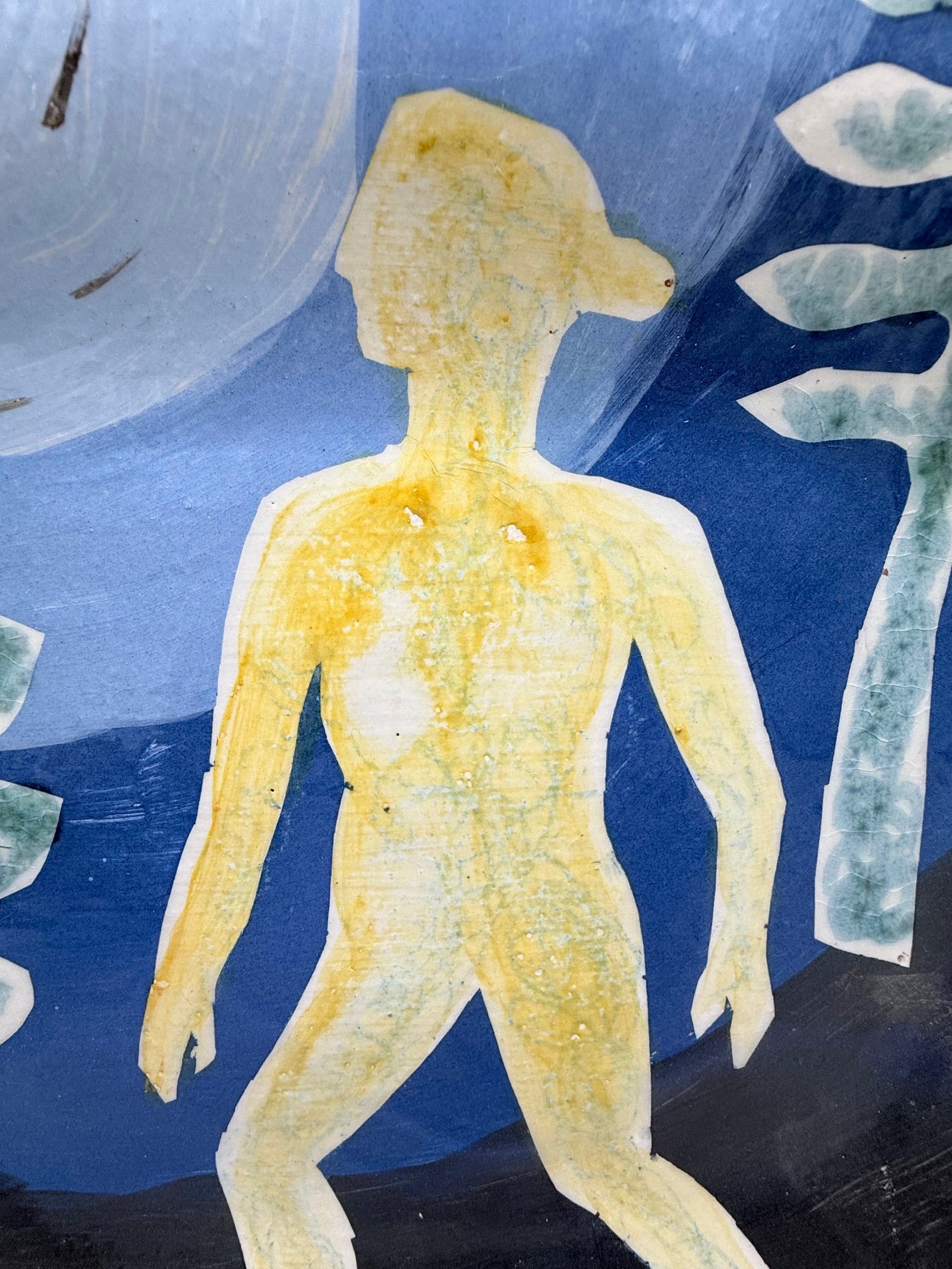 Ceramic platter featuring a hand-painted scene titled "Moonlight Walk," depicting a figure beneath trees and a glowing moon. By contemporary artist, Kate Reynolds - signed on back,