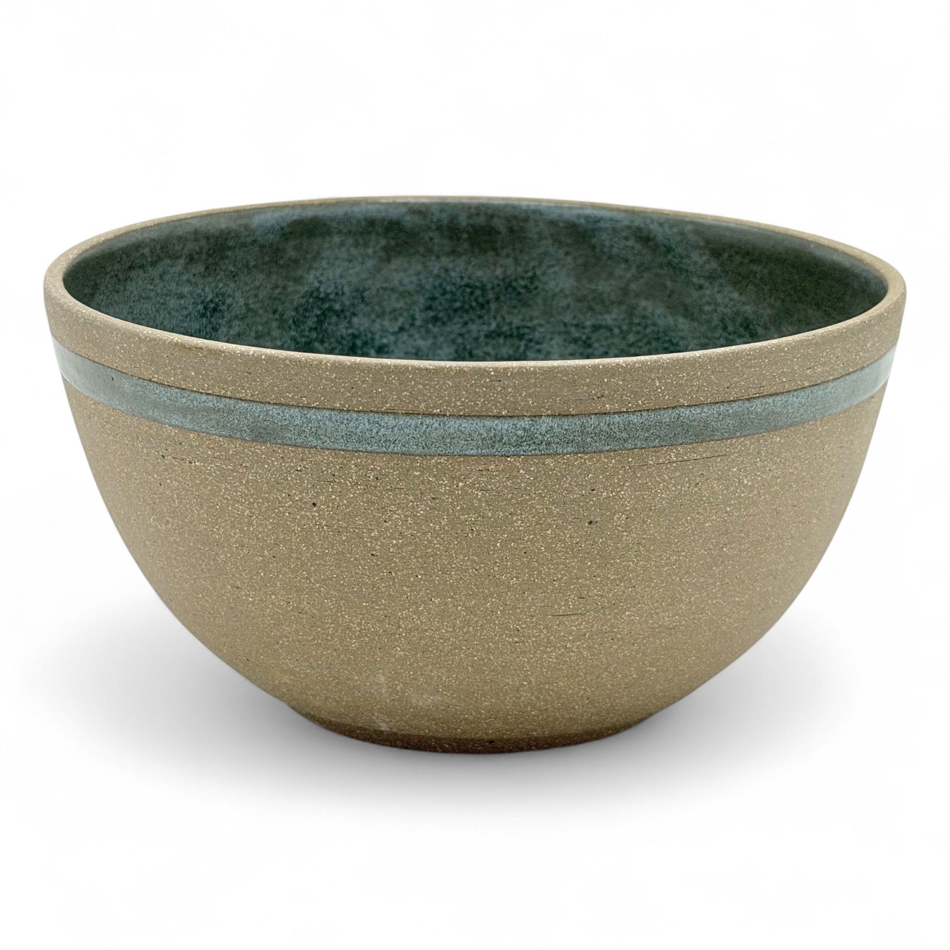 Handmade brown stoneware bowl with green stripe and interior glaze
