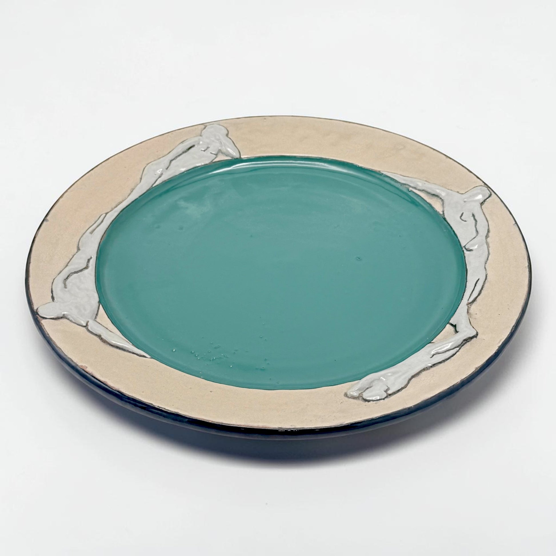 Italian studio ceramic platter with green glaze center and four relief-modeled nude figures at the rim.