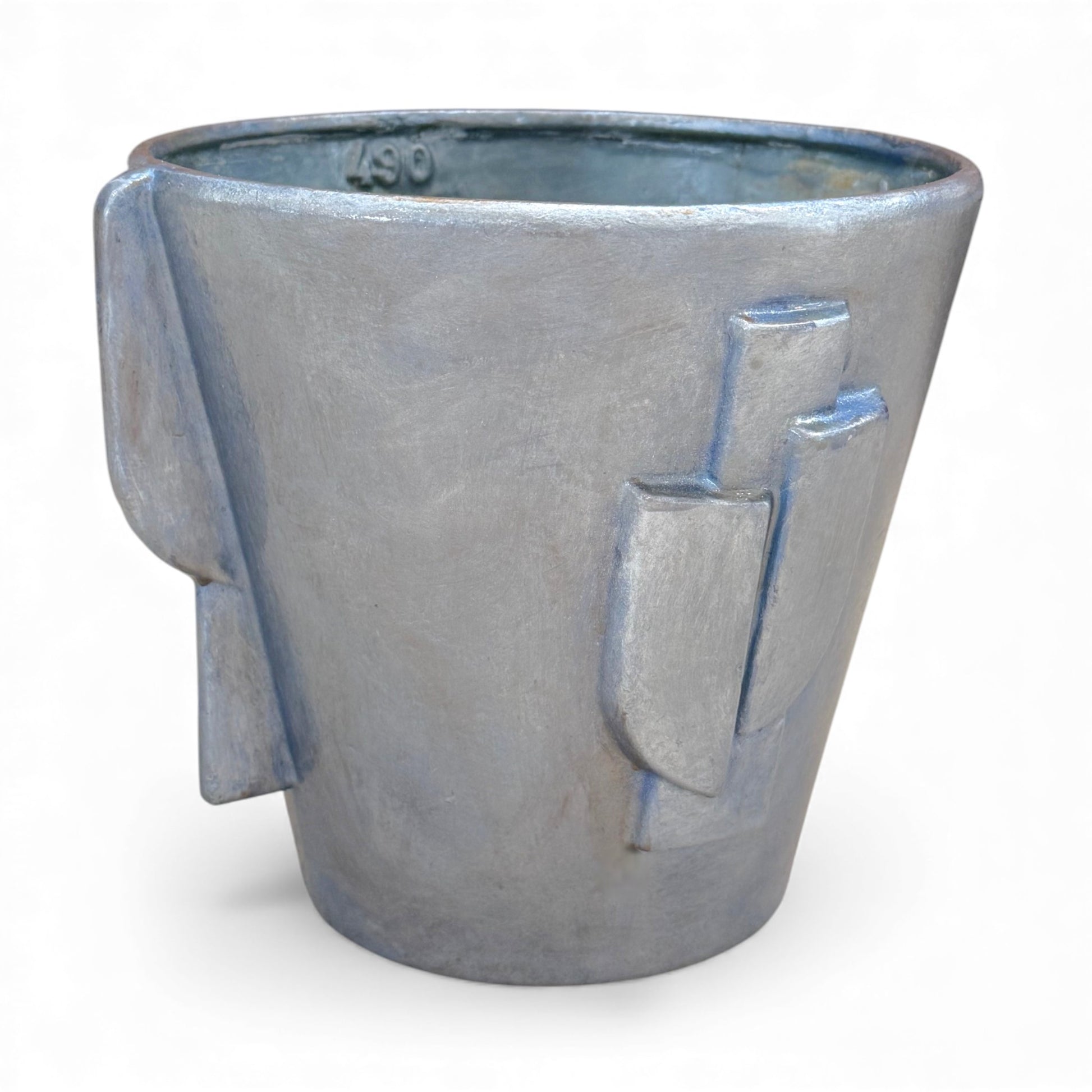 Vintage cast iron steel blue enamel plant pot with Art Deco design on sides