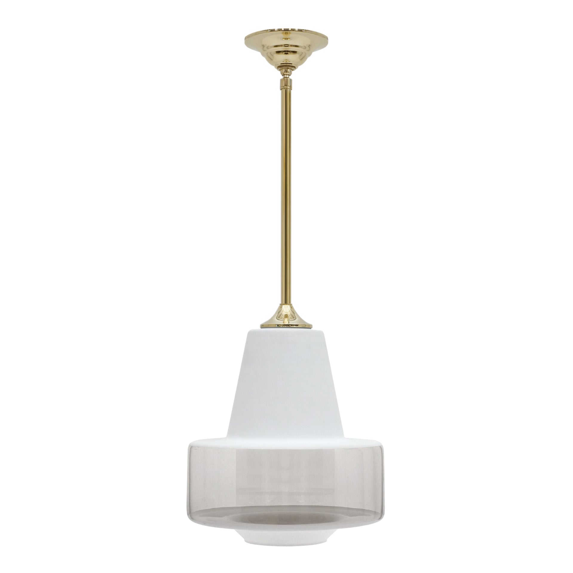 Italian Mid Century frosted white and clear glass pendant light with brass mounts and canopy. Newly wired for US Specifications (Not UL Listed)