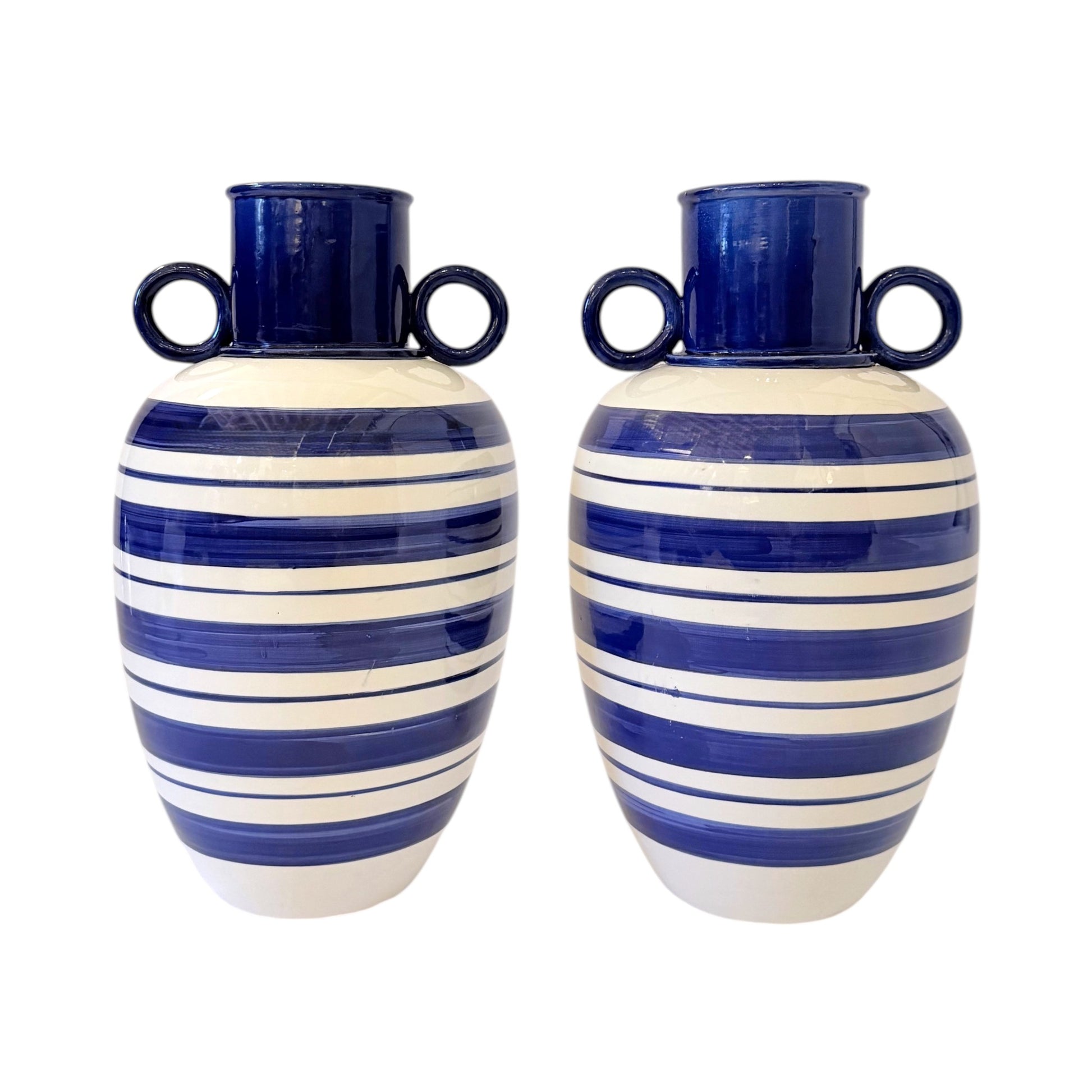 Pair of Italian handmade ceramic vases with bold, cobalt blue and white horizontal stripes and ring handles. Signed, M.C. on base.