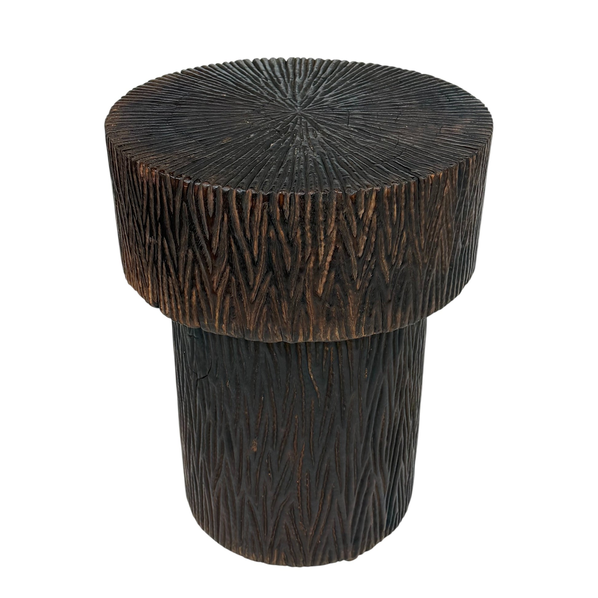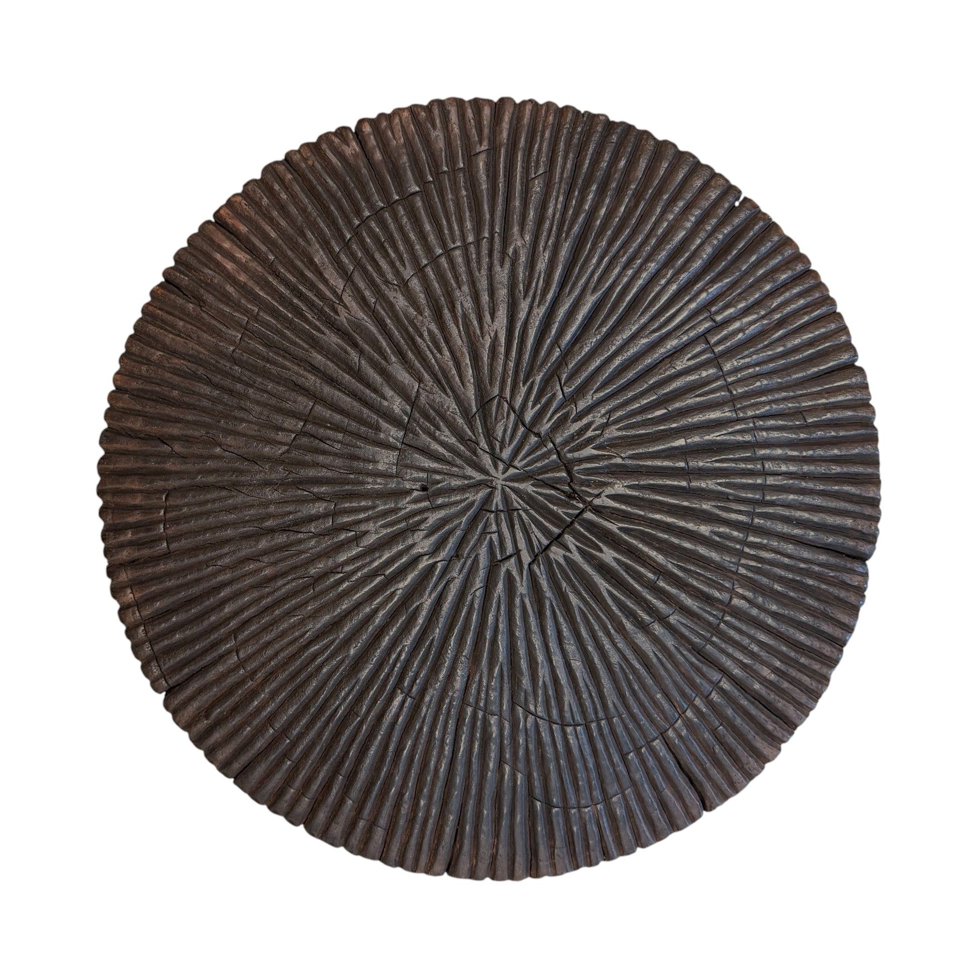 Pair of circular solid, hand carved teak side tables, the top with sunburst design, the base vertically carved