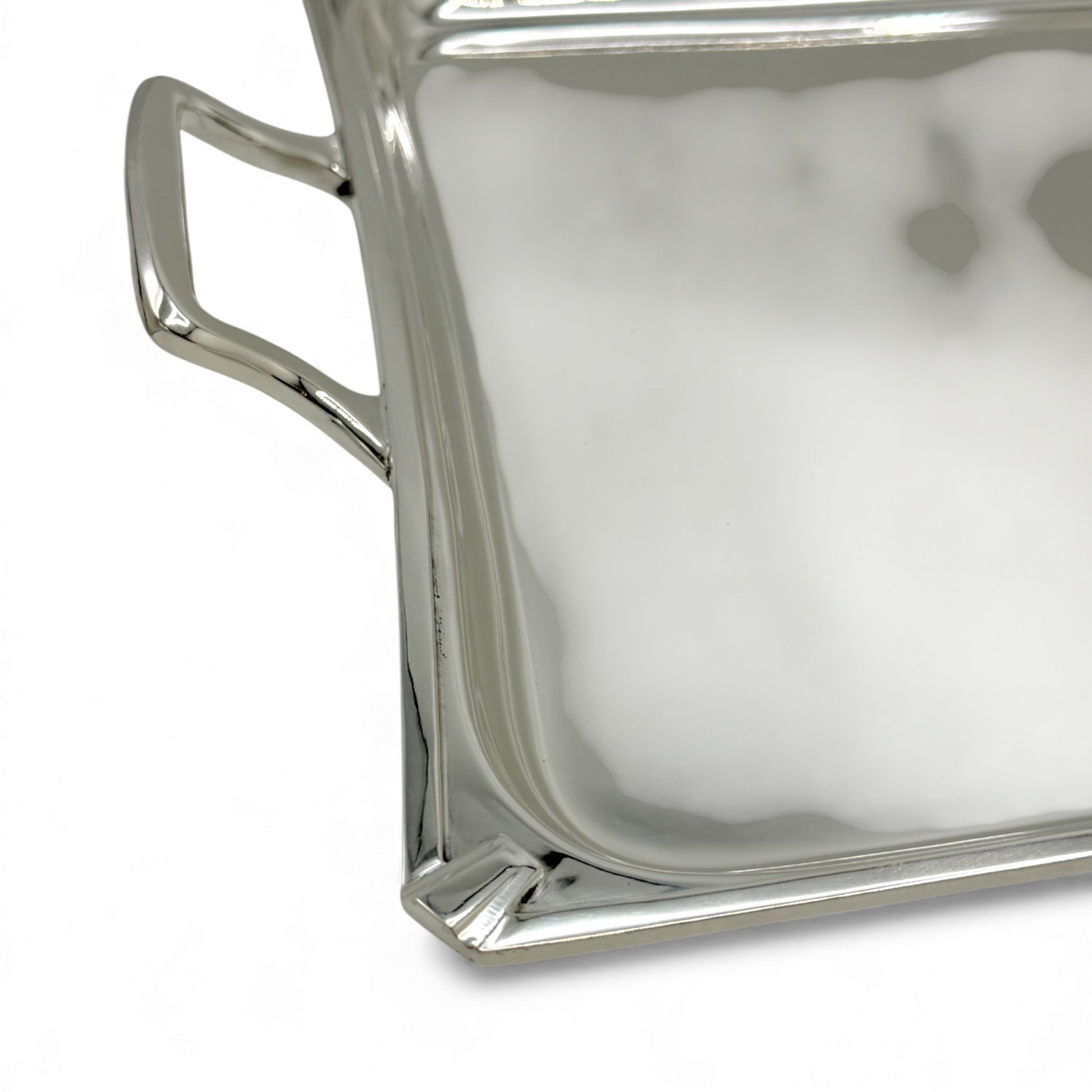 Shaped rectangular silver plate tray with small Art Deco corner decoration, and D shaped handles