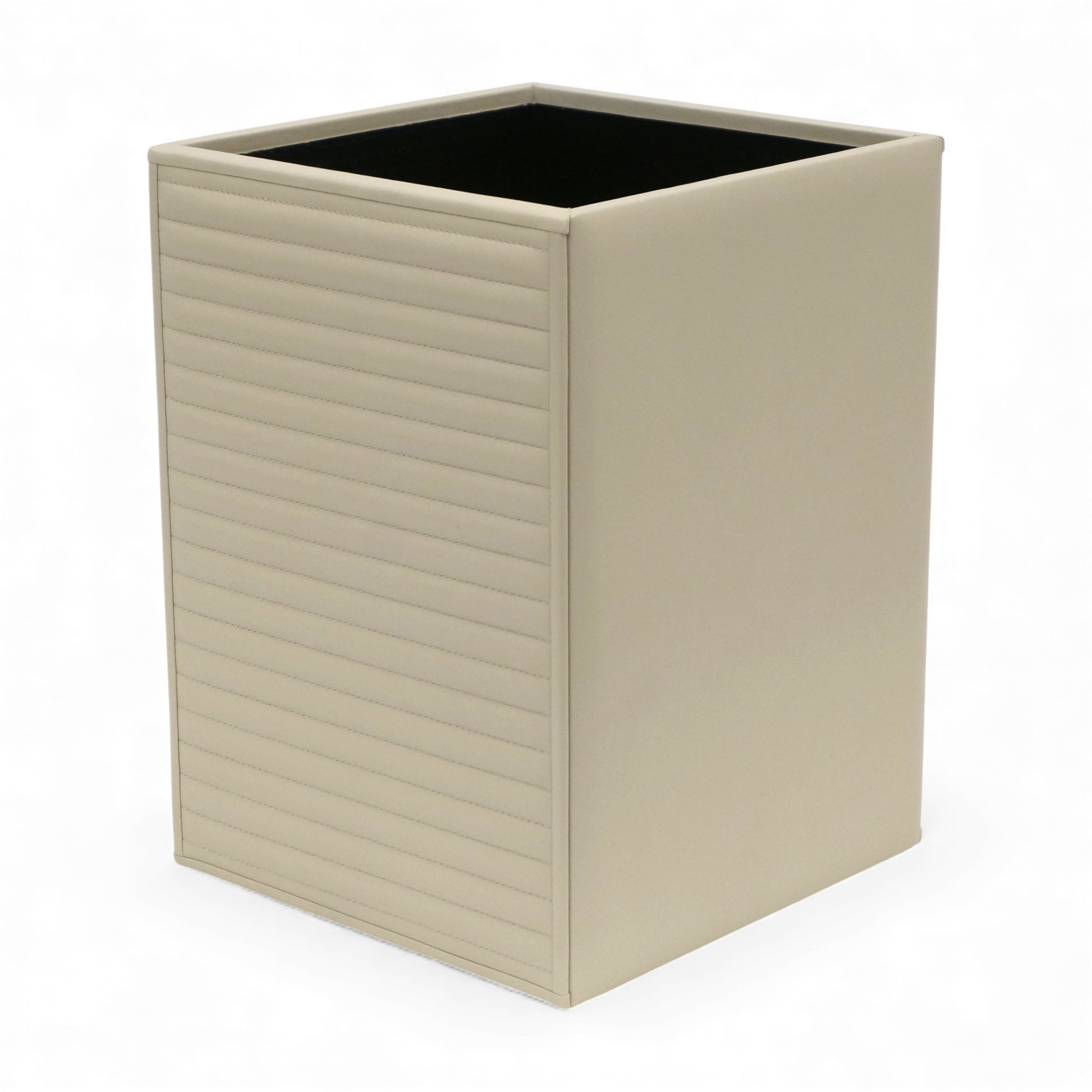 Square waste basket with premium ivory leather ribbed exterior, complemented by a warm wood-lined interior. Hand crafted in Italy.