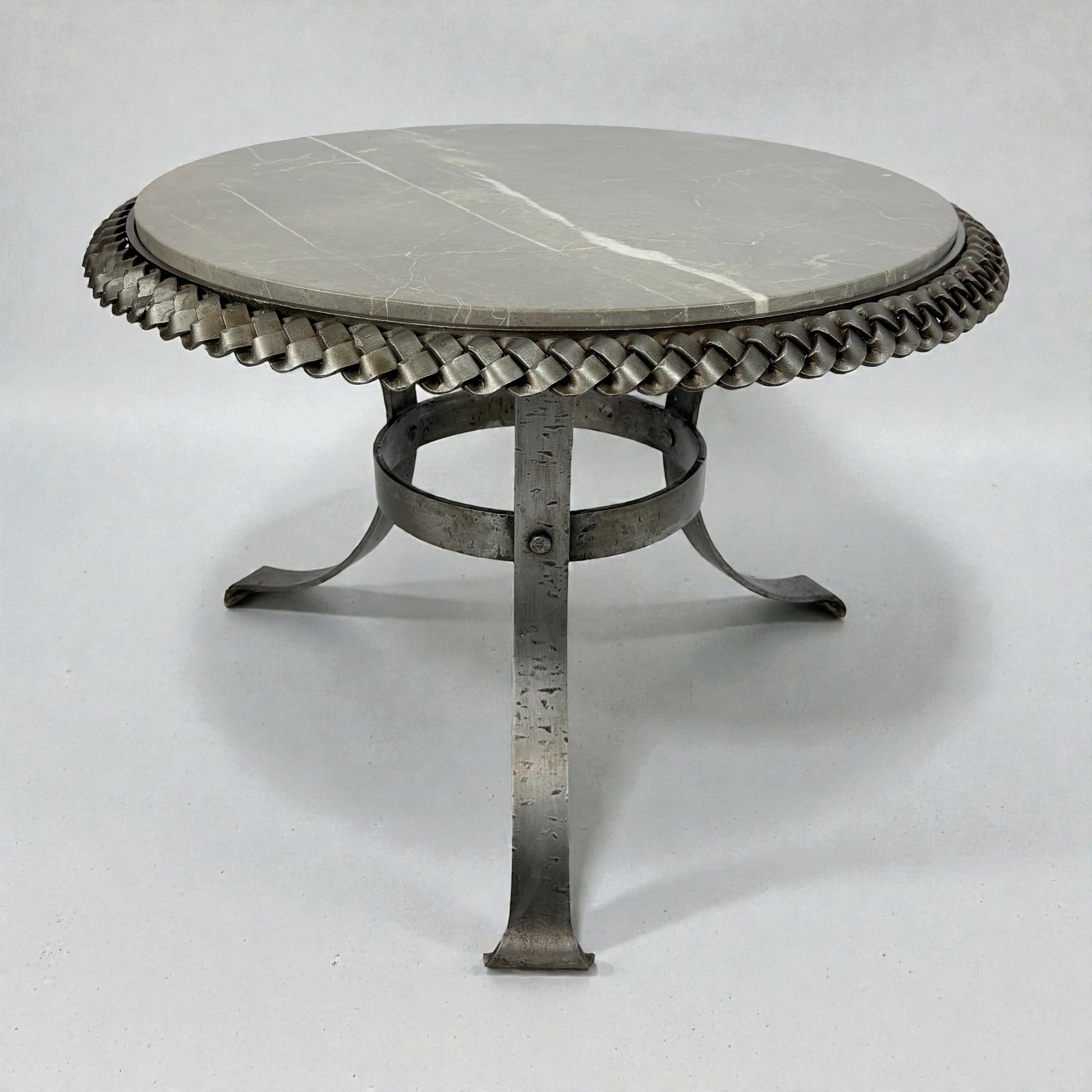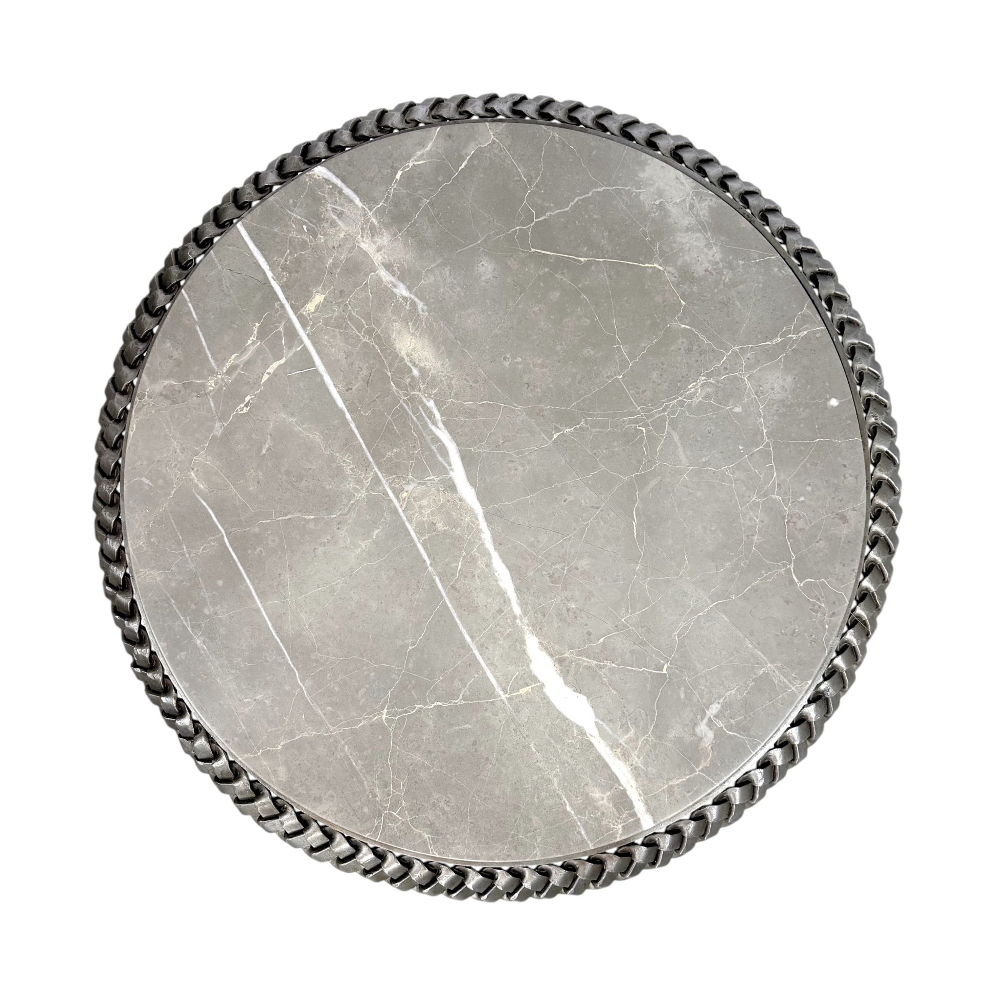 Round steel side table with braided border, curved textured legs and Griglio Collemandina marble top