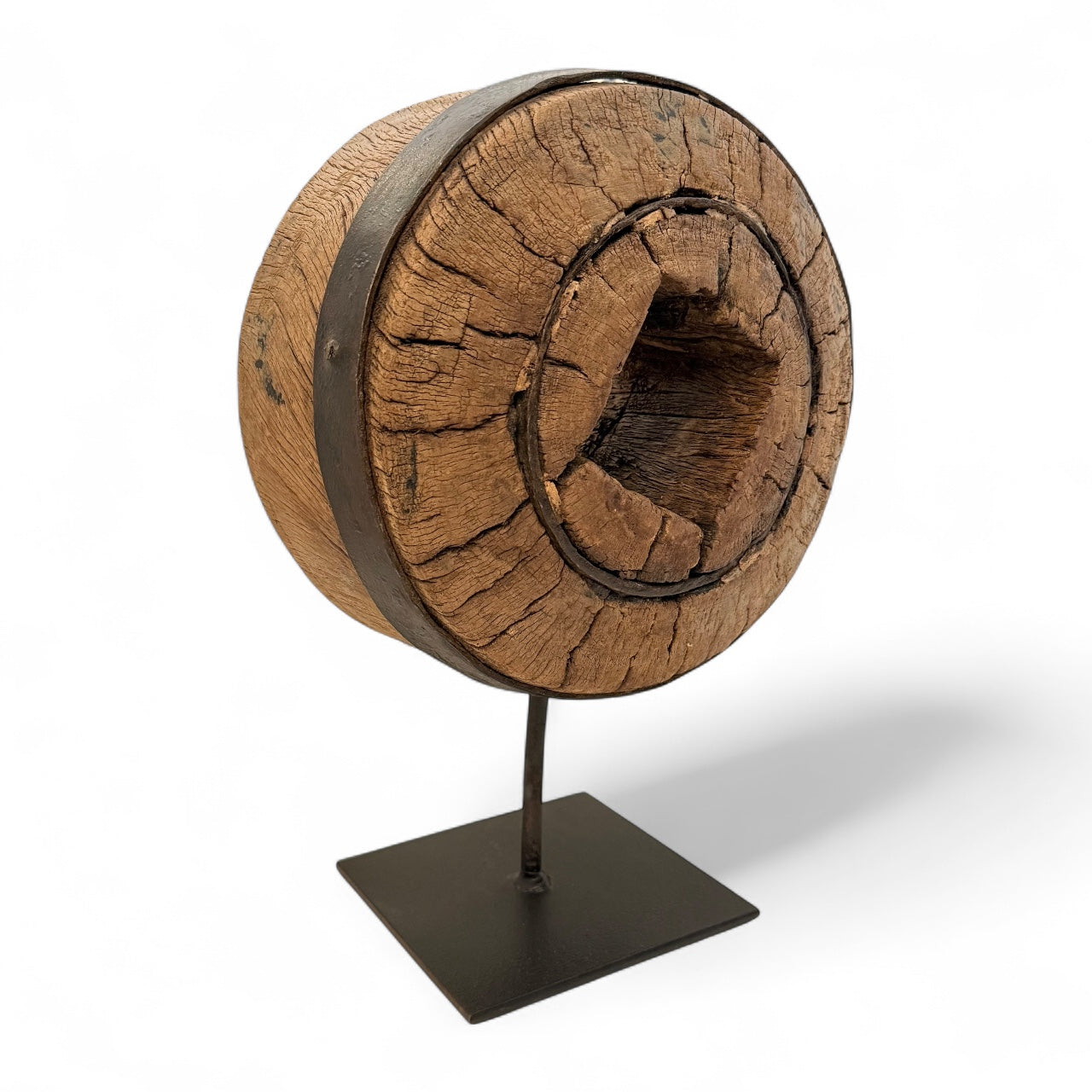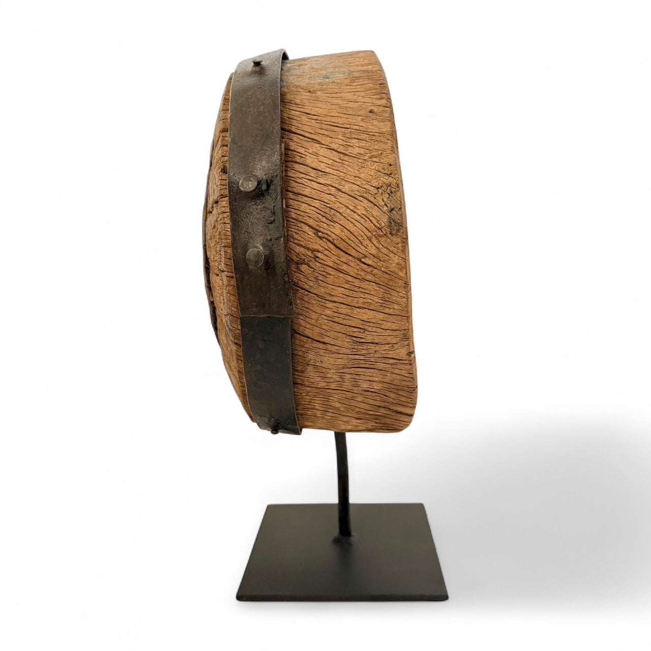 Carved wooden wheel with innerand outer iron band mounted on metal stand