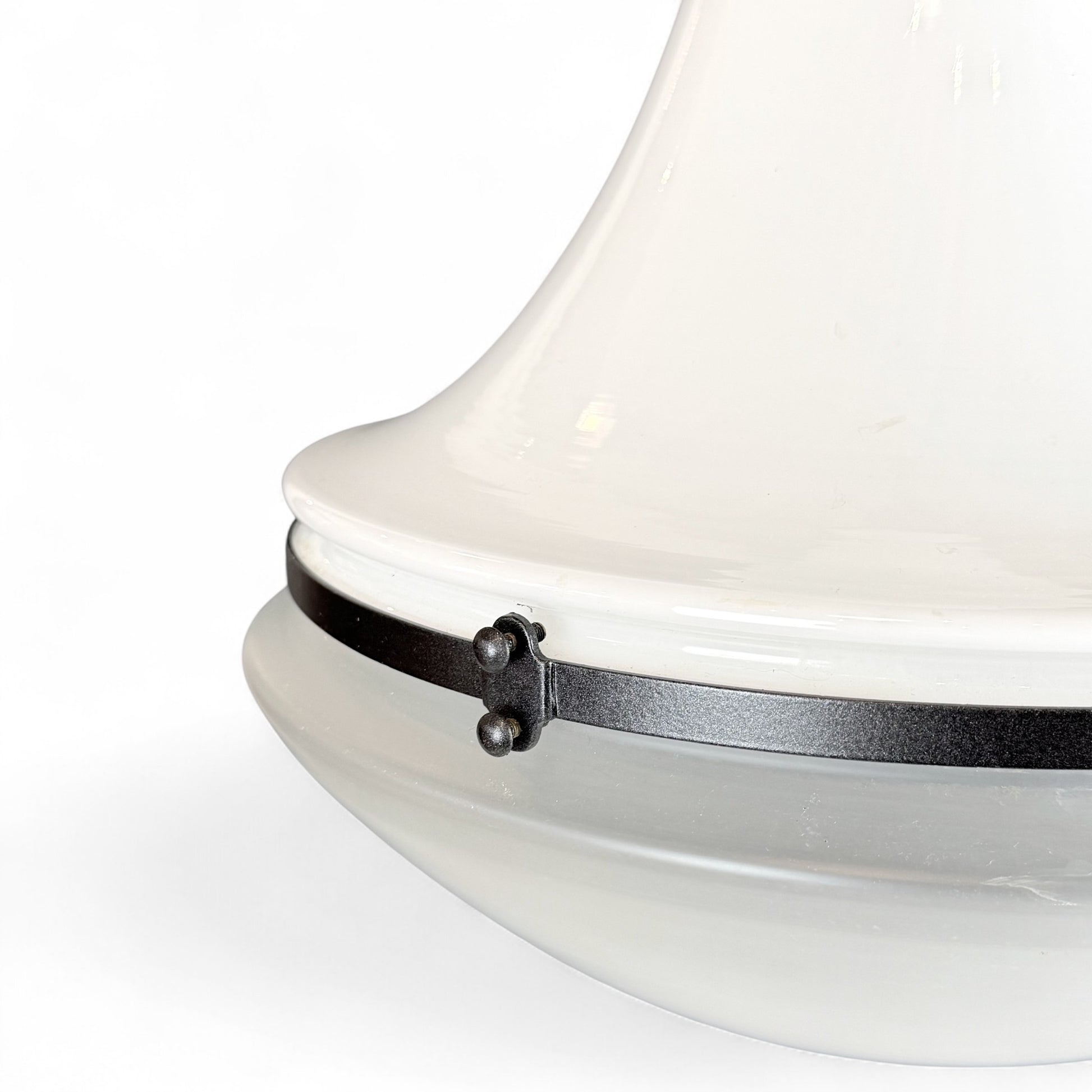 Set of three Art Deco opaline and frosted glass “Luzette” pendant lights by Peter Behrens for Siemens