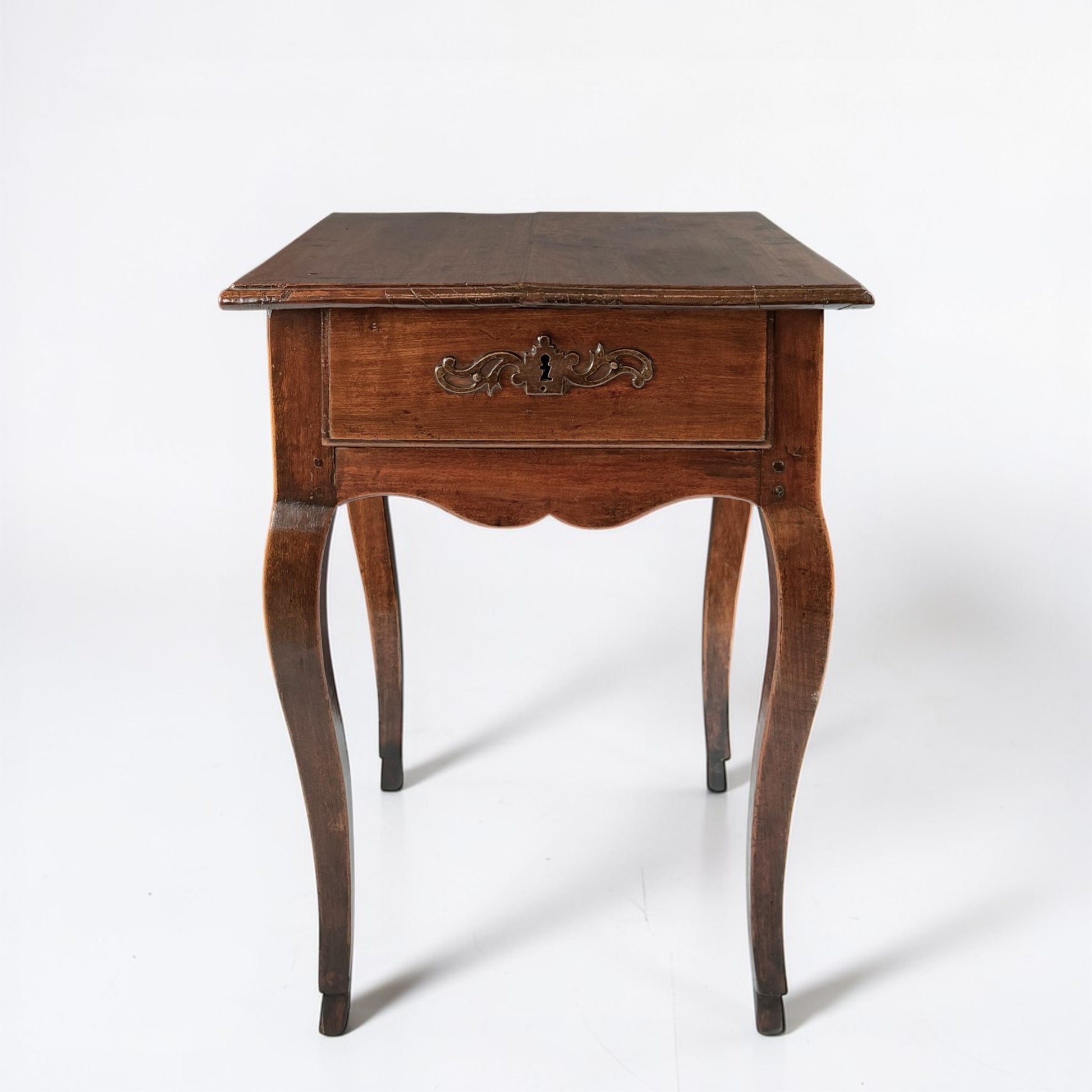 Antique French walnut side table with side drawers, original iron hardware and curved, tapered legs